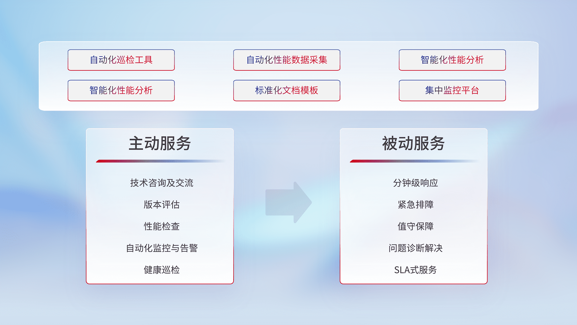 智能化工具和标准化文档,,保障服务质量,,提供主动服务(包含技术咨询、、版本评估、、、、性能检查、、、自动化监控与告警、、、、健康巡检)和被动服务包含(分钟级响应、、、紧急排障、、、、值守保障、、、、问题诊断解决、、、SLA服务)。。。。