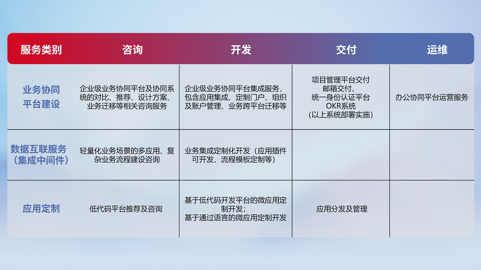 针对钉钉、、、、企微、、、、IDaas等平台级产品提供产品的规划、、方案、、、、交付、、、定制化开发等服务,,,实现如统一协同办公、、智能客户服务、、、、混合会议管理、、、智能数据查询、、等业务场景,,实现数字化转型。。。